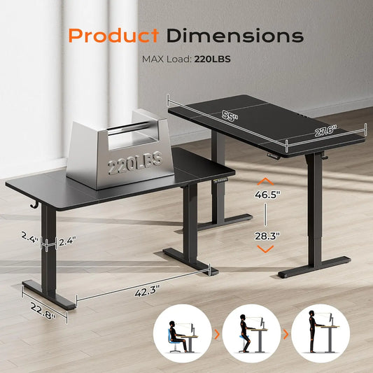 Large Electric Standing Desk 55 x 28 Height Adjustable Computer Desk 27.6 Deep Desktop with 2 Hooks for Home Office Black